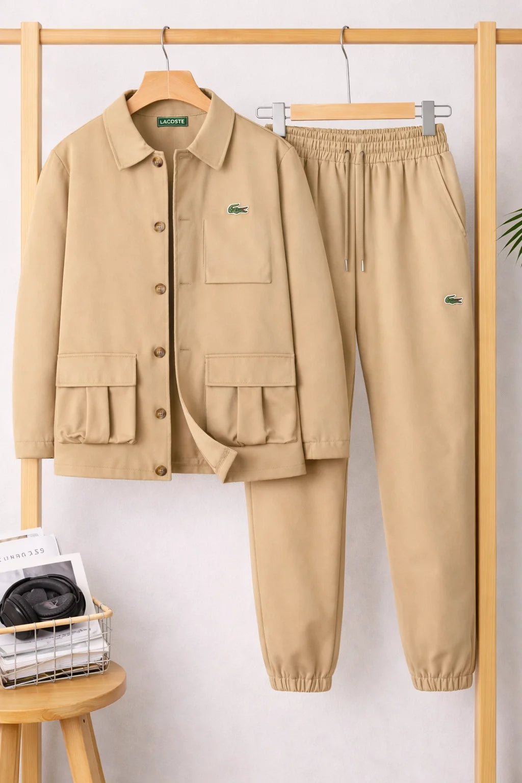La chaqueta destaca por su cuello clásico, su cierre abotonado y sus prácticos bolsillos de parche, que le aportan un toque contemporáneo y masculino. Los pantalones, con cintura elástica con cordón y bajos ajustados, garantizan un ajuste cómodo y una silueta armoniosa.